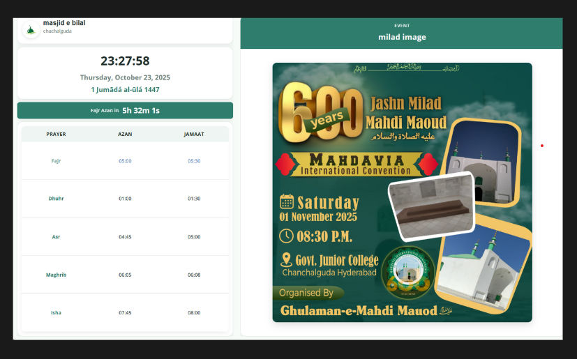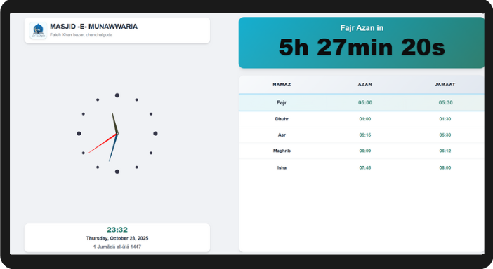 Display prayer times and key messages together. Screen auto-switches near Salah, then returns to announcements—a smart fit for any masjid space.